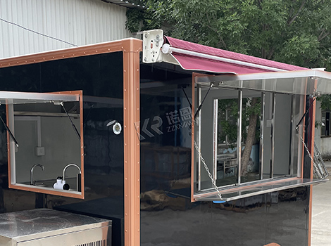 Furthermore, a dedicated space next to the sales window is reserved for menu posters, making it easy to display your offerings attractively. This feature helps customers quickly see what is available and make their selections, enhancing the overall customer experience. The cart is also equipped with seven American standard plugs, ensuring that various kitchen appliances can be powered simultaneously without any issues. This is crucial for maintaining a smooth workflow during busy periods.